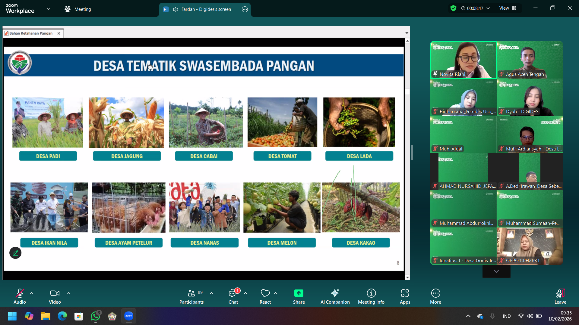 Webinar tersebut menghadirkan Novita Riani, S.Pi., M.Si, selaku pemateri dari Kementerian Desa, Pembangunan Daerah Tertinggal, dan Transmigrasi (Kemendes PDT) Republik Indonesia. Dalam pemaparannya, ia menekankan peran strategis desa sebagai garda terdepan dalam menjaga ketahanan pangan nasional yang berkelanjutan.