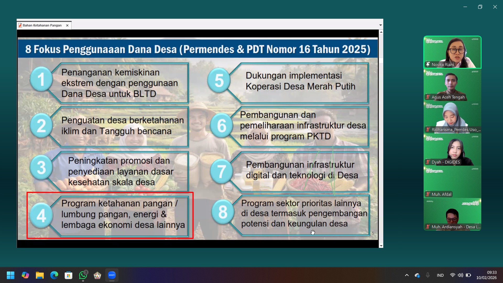 Novita Riani menjelaskan bahwa desa memiliki potensi besar melalui pemanfaatan sumber daya lokal, penguatan Badan Usaha Milik Desa (BUMDes), serta pengelolaan sektor pertanian, perikanan, dan pangan secara terintegrasi. Ia juga mendorong pemerintah desa untuk menyusun perencanaan berbasis data dan kebutuhan masyarakat agar program ketahanan pangan dapat berjalan efektif dan berkelanjutan.