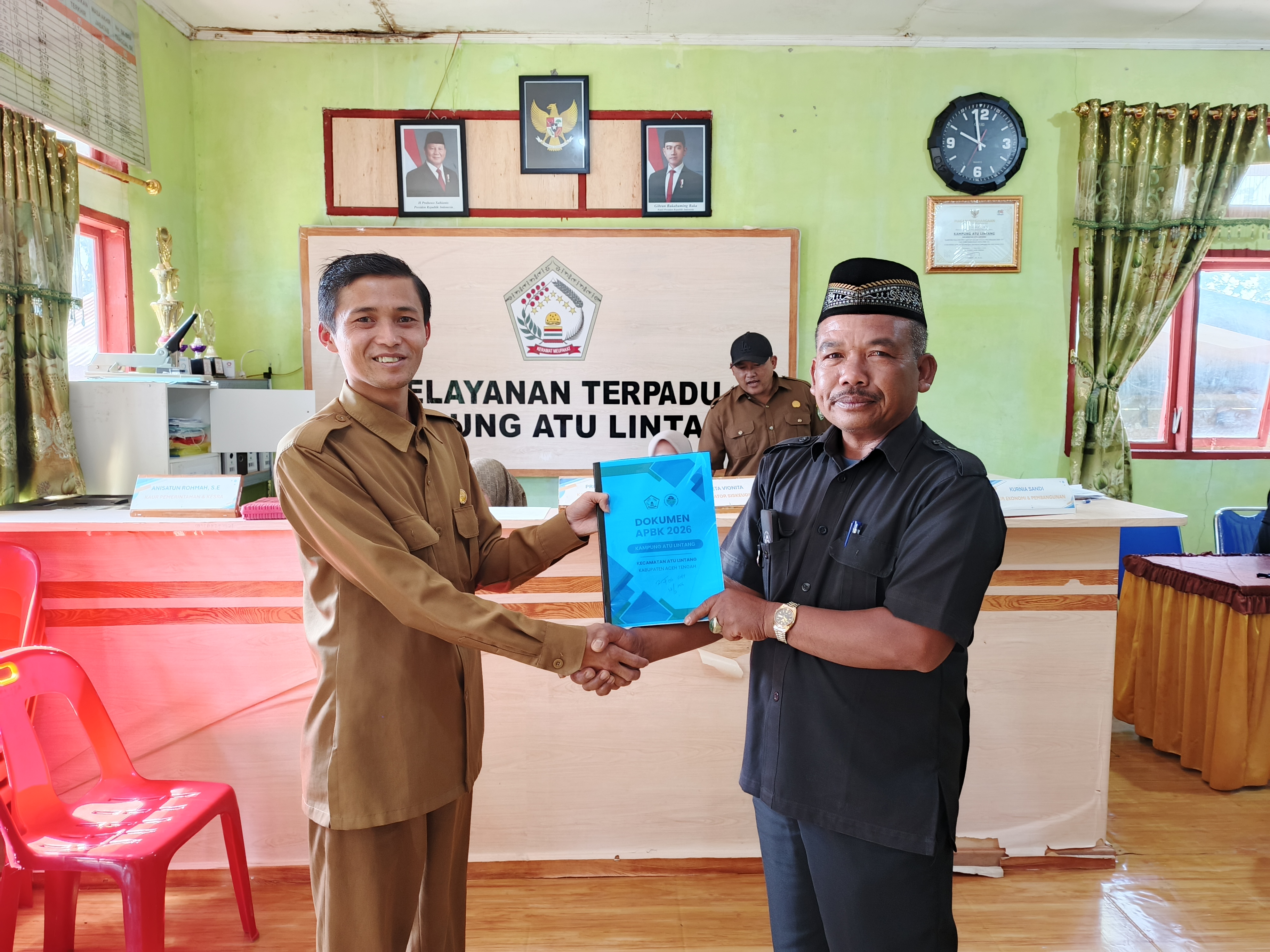 atulintang.des.id - Pemerintah Kampung Atu Lintang melaksanakan penyerahan dokumen Anggaran Pendapatan dan Belanja Kampung (APBK) Tahun Anggaran 2026 kepada Rayat Genap Mupakat (RGM) Kampung Atu Lintang pada Senin, 23 Februari 2026. Kegiatan tersebut berlangsung di Kantor Reje Kampung Atu Lintang, Kecamatan Atu Lintang, Kabupaten Aceh Tengah.
